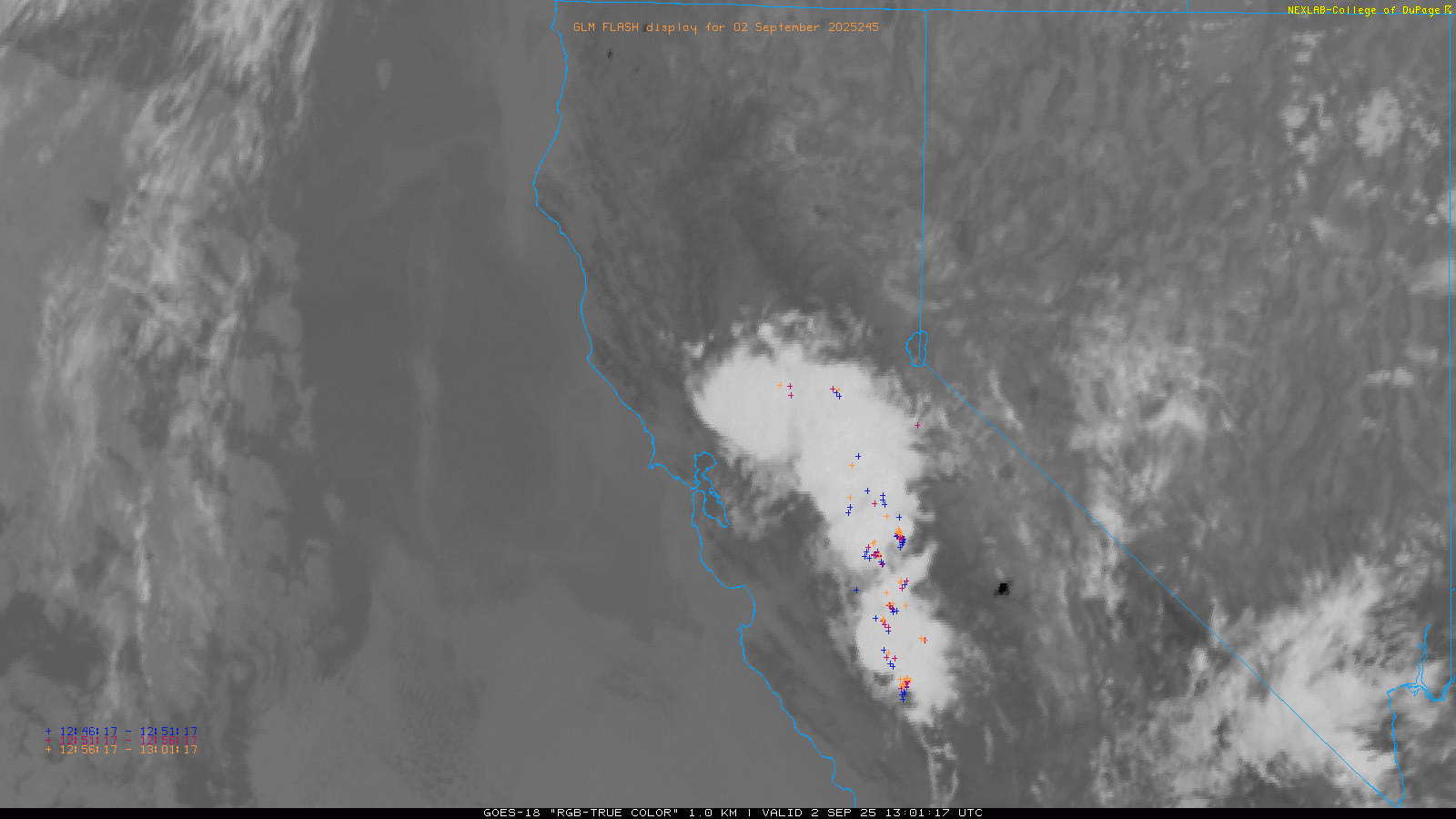 Turning to those imminent weather threats, this week the main focus for impact weather will be in the western United States and Canada. This morning, clusters of thunderstorms producing frequent cloud to ground lightning have been moving through central California as shown in this morning satellite loop with GOES Lightning Mapper lightning flashes overlaid. While these storms are not completely dry, they are moving through an area with very dry conditions and SF Chronicle meteorologist Anthony Edwards wrote this morning about wildfires already being ignited across the region by this thunderstorm activity. (Note that that in the satellite loop above you can see the hotspot of a large wildfire just east of the thunderstorm activity in the overnight infrared data, and when the sun comes up you can see the large smoke plume pushing north of it.)