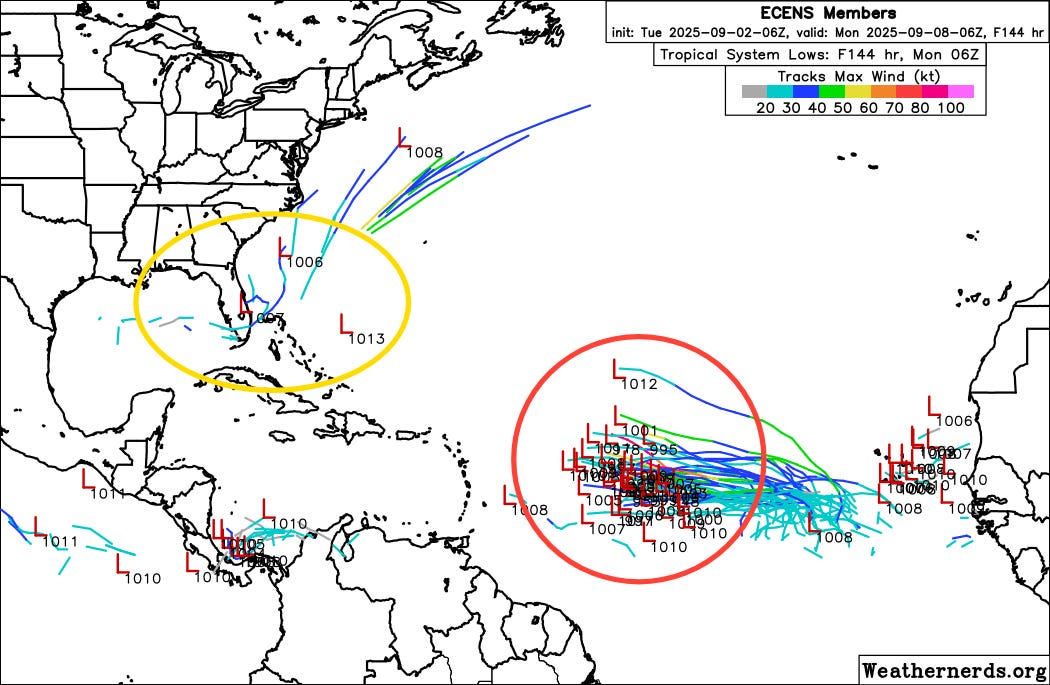 We also continue to keep a little watch on the old front over the Gulf and southwest Atlantic. Old fronts over warm water are always a little concerning in September, and the models continue to sporadically try to generate a weak system as shown in the yellow area on the European ensemble above. Right now though there is nothing to focus on for any specific risk.