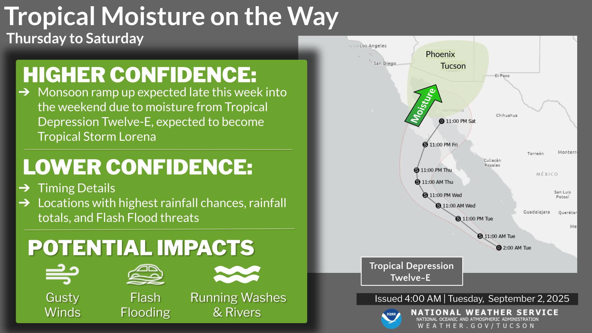 The threat for thunderstorms with heavy rainfall and localized significant flash flooding should increase through the week, but as the graphic from NWS Tucson notes the forecasts for the most impacted locations and magnitude of rainfall and impact will evolve as we monitor the evolution of Lorena. The monsoonal moisture feeding the thunderstorms over California this morning will bring a risk of localized flash flooding today to parts of the region, and a flash flood watch is in effect for the deserts of southern California.