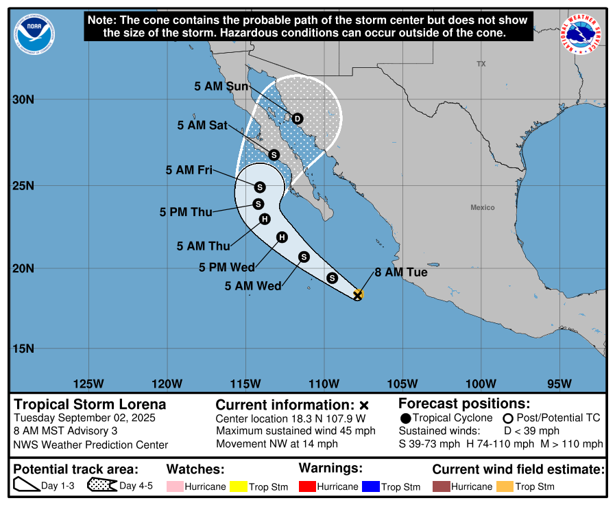 Meanwhile, in the usually dry desert Southwest, the potential for thunderstorms and heavy rainfall will be the focus this week. Tropical Storm Lorena has formed in the eastern Pacific off the western Mexican coast, and as we have been talking about for a few days now, the track of this system looks to bring a surge of moisture into the Southwest over the next several days.