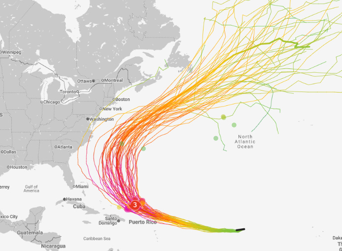 As of now the models (Google AI ensemble shown above) continue to show Erin passing just northeast of the Puerto Rico and the Leeward Islands and then between the east coast of the United States and Bermuda. At a minimum, the track of Erin could certainly be close enough to cause some rain and wind impacts to the northeast Caribbean islands, and people with interests there should be monitoring forecasts closely. Farther downstream, while the models show any direct impacts to the US beyond rip currents are unlikely at this point, we are still several days away from the anticipated turn to the north so forecast changes are still possible. Bermuda of course should be monitoring Erin closely.