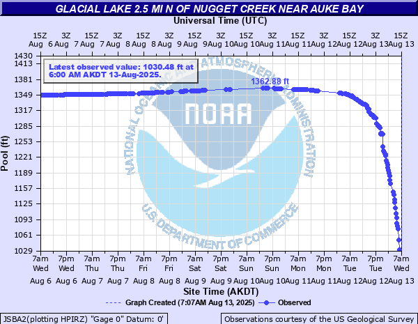 This graph shows the plot from the USGS water level gauge in the Suicide Basin, dramatically showing how the water level is plunging as the water drains out of the glacial lake into the Mendenhall River. This data was absolutely crucial for the NWS —the agency responsible for river flood warnings and forecasts — to know when the glacial outburst started yesterday and have an estimate of how much water could potentially flow into the river, necessary data if one has any hope of making a reasonably accurate river forecast.