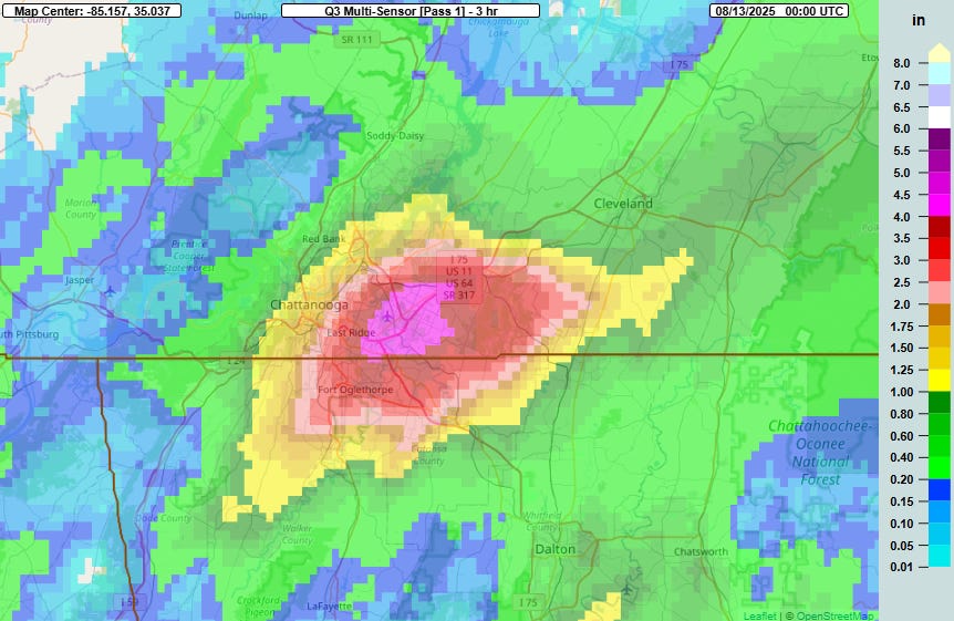 Speaking of flooding, another metro area had to deal with impactful flash flooding yesterday. Chattanooga, TN officially reported 6.42” at the airport on Tuesday, a daily record and the second highest daily rainfall total on record. Much of this rain fell in just a few hours as can be seen on the 3-hourly rainfall map from 8 pm ET last night and resulted in major flash flooding.