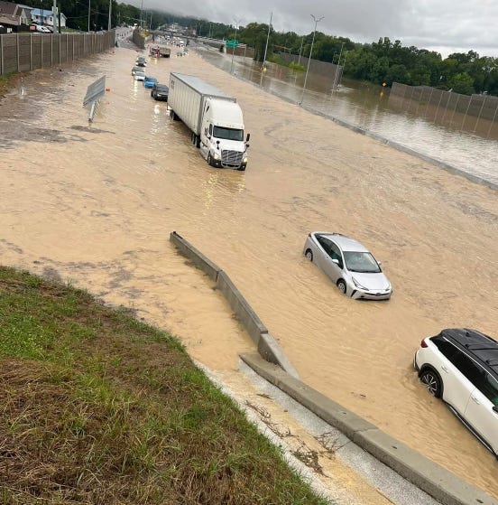 Interstates in the region were flooded as shown above (picture from NBC News) and people were trapped in homes, resulting in emergency officials having to make numerous water rescues. Unfortunately, one person was swept away by floodwaters and is missing, and 3 others were killed in the area when a tree fell on their car.