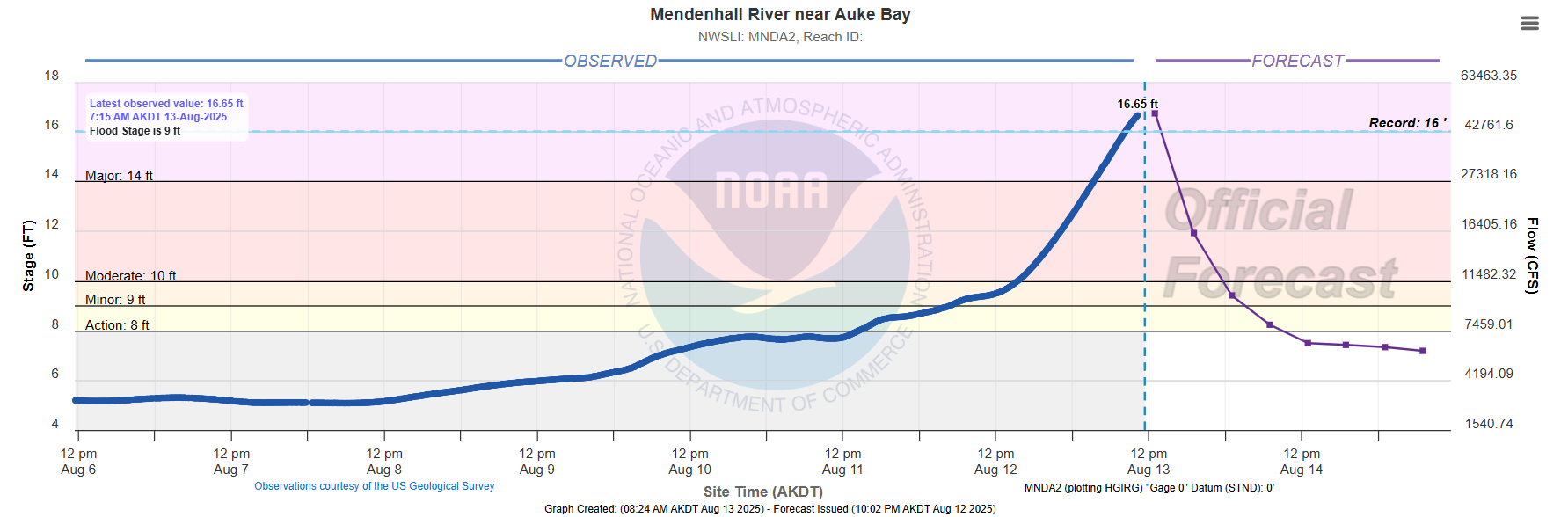 Starting off this morning with some breaking news on the glacial outburst flood event in Juneau that I posted about yesterday afternoon. Earlier this morning as forecast by the National Weather Service (NWS), the US Geological Survey (USGS) streamflow gage on the Mendenhall River near Juneau passed its record level of 16’, and just crested at 16.65’ and per NWS Juneau has started to fall.