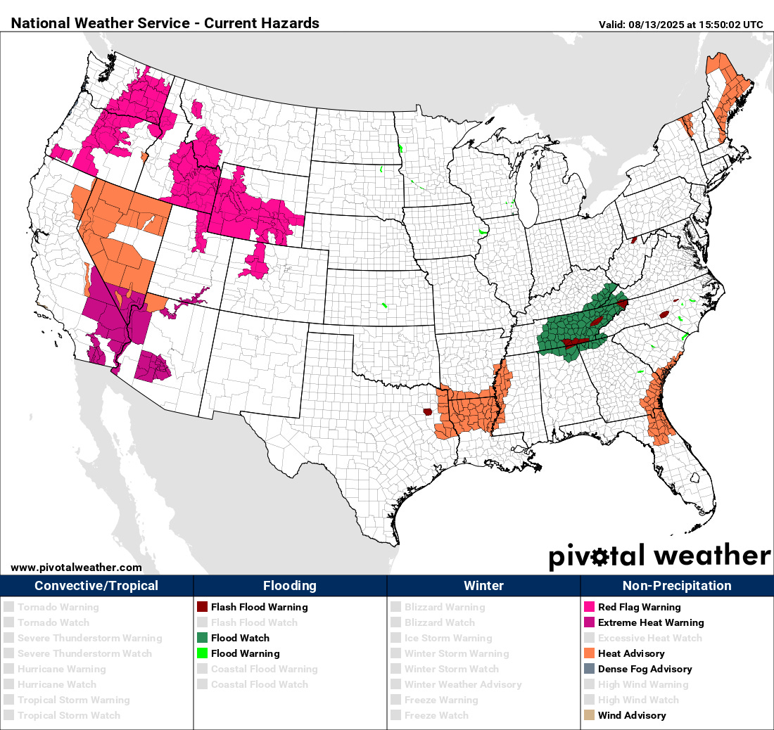 Additional thunderstorms with heavy rainfall are expected in the Tennessee Valley region again today, and flood watches are in place. More heat is expected in the West today, and fire danger will become a serious concern again as winds increase and high based thunderstorms with lightning and gusty winds are anticipated. Red flag warnings are in effect for much of the interior Northwest and Intermountain West.